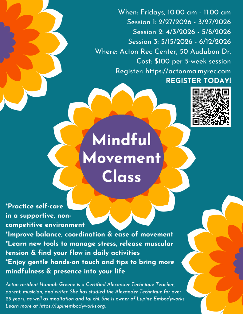 My final free workshop at Acton Memorial Library is at the end of the month, and then on April 3, I start the next series of Mindful Movement Classes, in partnership with Acton Recreation Department. Information is below.