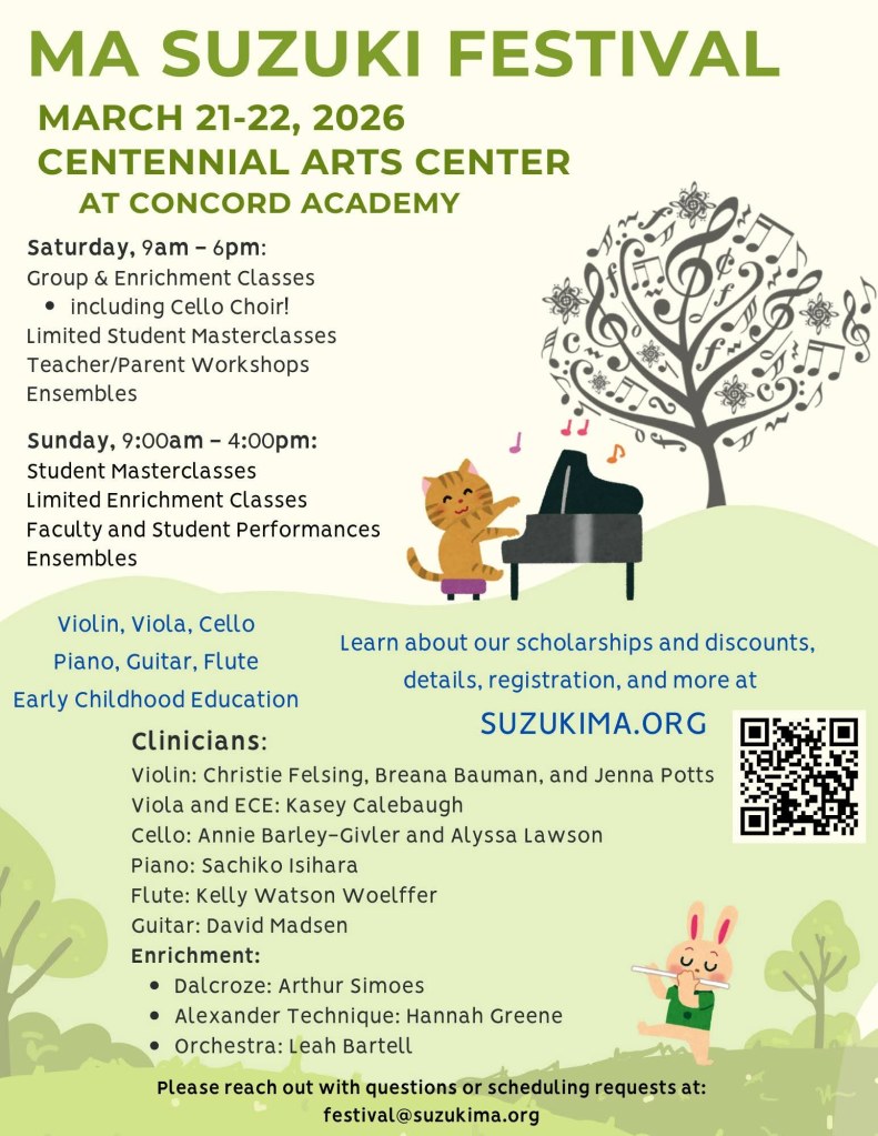 I have a few new offerings this spring to share. The weekend of March 21-22, I will be offering a series of AT workshops at the Suzuki Festival at Concord Academy. As a former Suzuki student myself, I am beyond excited for this opportunity. If you know any Suzuki families, please pass on the registration information. Click on the image below, or scan the QR code.